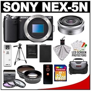 Kit includes: ♦ 1) Sony Alpha-5N NEX body Digital Camera (Black) ♦ 2) And Sony Alpha 16mm f / 2. 8 Lens ♦ 3) overcome 32GB Secure Digital Class 10 (SDHC) ♦ 4) Additional Battery for Sony NP-FW50 ♦ 5) Zeikos Shutter Release Wireless Remote Control ♦ 6) Zeikos 3-piece Multi-Coated Glass Filter Kit (UV 49 mm / FLD / PL) ♦ 7) Zeikos 50 "Travel Tripod ♦ 8) PD 0.45 x 2x telephoto wide angle lens digital ♦ 9) PD-C15 Camera Case Digital Camera / Video ♦ 10) PD USB 2.0 SecureDigital (SDHC ) Memory Card Reader ♦ 11) Microfiber Cleaning Cloth Spudz PD ♦ 12) PD Memory Memory Card Wallet ♦ 13) LCD Screen Protector