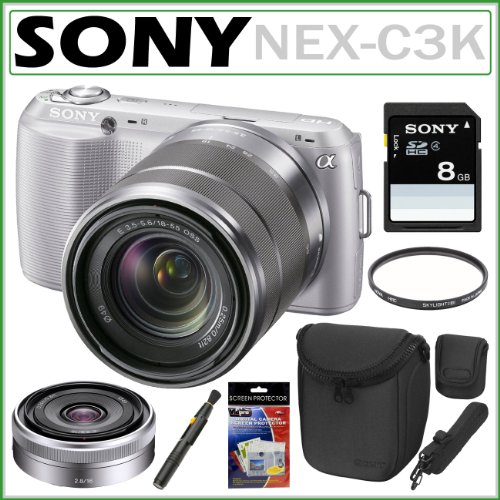 Sony Alpha NEX-C3K 16 MP Compact Interchangeable Lens Digital Camera in Silver with Sony SEL1855 18-55mm Zoom Lens and SEL16F28 by Sony